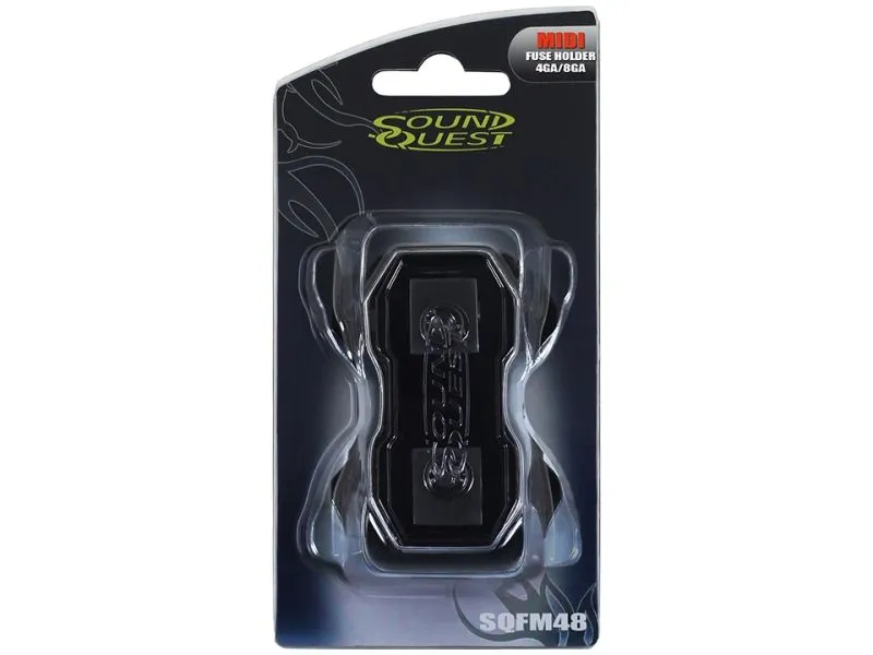 Sound Quest SQFM48 — держатель предохранителя типа mini ANL (MIDI) c латунными контактами. Позволяет подсоединить кабель сечения 4 Ga или 8 Ga (с помощью сменных втулок и резиновых прокладок входящих в комплект поставки).